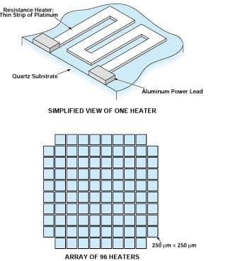 The device (see figure) includes a quartz substrate that supports a square array of 96 electrical-resistance heaters. Each heater occupies an area of 250 by 250 µm. The resistive heating element in each heater is a platinum strip 5 µm wide, 0.4 µm thick, and 6 mm in total length; the lateral gap between adjacent parallel portions of the strip is 5µm. Each strip has an electrical resistance of ≈ 1 kΩ with a temperature coefficient of resistance of 2 × 10 –3 °C –1. Heater power is supplied through aluminum lines routed between the heaters to the edge of the array.