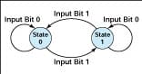 The NRZM code and the Binary NRZM algorithm can be explained in terms of a finite-state automaton that can be in either of two states; 0 or 1 (see figure). These states correspond to output bits. If the automaton is in either state and receives an input bit 0, it remains in that state. If the automaton is in either state and receives an input bit of 1, it changes to the other state. Thus, the output bit for a given input bit depends on the state of the decoder after receipt of the immediately preceding input bit; this state is called the "last state." The last state depends on the chosen initial state and on the sequence of input bits up through the immediately preceding bit.