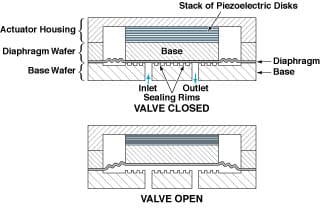 The valve begins as three separate parts: the base (which includes the seat), the diaphragm, and the actuator. The base, which is micromachined out of silicon wafer, contains the inlet and the outlet. The seat area on the inner (upper in the figure) surface of the base is textured with two sets of sealing rings: one centered on the inlet, the other centered on the outlet. The diaphragm, also micromachined out of a silicon wafer, features circular corrugations near its outer diameter and a central circular boss that covers both openings in the seat. The actuator consists of a stack of piezoelectric disks in a rigid housing machined out of a silicon wafer. A Ti/Pt/Au layer is evaporatively deposited on the faying surfaces of the three parts, then the parts are heated and pressed together to join the pieces with metal-to-metal diffusion bonds.