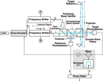 The figure schematically depicts a heterodyne interferometer configured for measuring a target path of length L. This interferometer is augmented to suppress self-interference by using phase modulation to distinguish between the leaked signal and the signal returning from the target. The following is a summary of the self-interference-suppression technique, omitting some details for the sake of brevity: