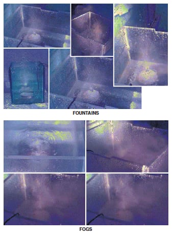 The mechanical simplicity occasioned by elimination of the need for pipes, valves, and pumps is an advantage over prior fountain display systems. Another advantage over such systems is much faster response: For example, in an ULIFOG system, one could change a fountain into a fog in a millisecond by switching the frequency of excitation of the applicable transducer.