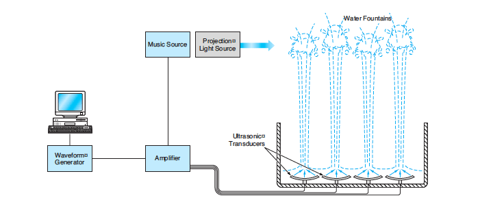 An apparatus proposed for implementing this concept is called an ultrasonically induced plumbing-free switchable multi-fountains and fog (ULIFOG) system. In addition to ultrasonic transducers immersed in a water bath, a ULIFOG system (see Figure 2) would include (1) electronic circuits to excite the ultrasonic transducers with waveforms chosen to produce the desired fountain and fog effects, (2) one or more source(s) of light (e.g., lasers or colored lamps), (3) a source of music, and (4) a computer that would control the aforementioned subsystems and would coordinate the visible and audible aspects of the display.