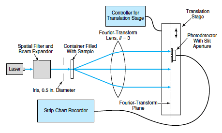 The filled container is positioned in the apparatus shown in Figure 2, at the focal point of the Fourier-transform lens. The container is illuminated with light from the laser. The intensity in the resulting Fourier-transform image is measured as a function of position along an axis perpendicular to the grooves. This measurement is performed by use of a photodetector with a slit aperture in the Fourier-transform plane; the photodetector is moved along this axis by use of a translation stage. The relative intensity measured as a function of position constitutes a Fourier signature that can be analyzed to determine the relative concentrations of particles (cells) of various sizes.