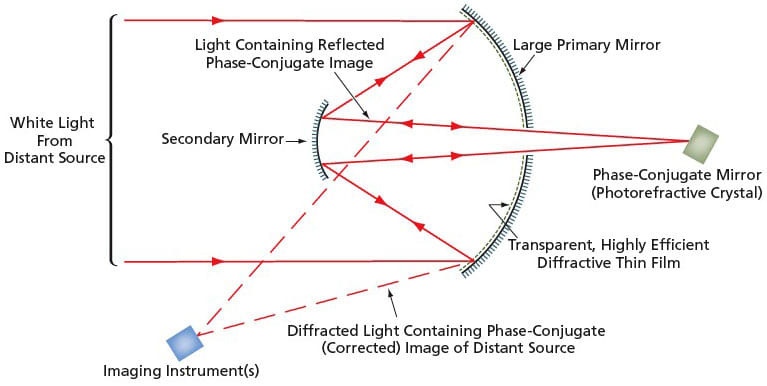 As used here, “phase-conjugate mirror” signifies, more specifically, an optical component in which incident light undergoes time-reversal phase conjugation. In practice, a phase-conjugate mirror would typically be implemented by use of a suitably positioned and oriented photorefractive crystal. In the case of a telescope comprising a primary and secondary mirror (see figure) white light from a distant source would not be brought to initial focus on one or more imaging scientific instrument(s) as in customary practice. Instead, the light would be brought to initial focus on a phase-conjugate mirror. The phase-conjugate mirror would send a phase-conjugate image back, along the path of the incoming light, to the primary mirror. A transparent, highly efficient diffractive thin film deposited on the primary mirror would direct the phase-conjugate image to the imaging instrument(s).