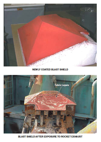 The figure shows a newly coated blast shield and a blast shield after an exposure to the rocket exhaust. The average thickness of the ablative coating when new was 0.542 in. (≈13.8 mm); the average thickness after exposure was 0.165 in. (≈4.2 mm). The thickness of the coating was found to be adequate everywhere except at two corners. Ceramic particles in the rocket exhaust did not adhere to the silicone rubber. The silicone rubber at the steel substrate and the laminate exhibited no visible signs of deterioration. This observation was interpreted as signifying that the ablative coat succeeded in keeping the temperature at the bond surface below 600 °F (below approximately 320 °C). Except for a minor surface crack at one corner, the blast shield was undamaged.