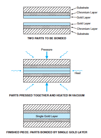 A technique of thermocompressive gold-to-gold diffusion bonding at relatively low temperature has been devised to provide stable, uniform, strong bonds between struc- tural components of microelectromechanical systems. The technique can also be used for vacuum sealing of microscopic cavities. Unlike some other metal-to-metal diffusion bonding techniques, this technique does not entail significant outgassing or the formation of intermetallic compounds. The technique is suitable for bonding of parts made of silicon, quartz, low-thermal-expansion glass, and other materials that can withstand the relatively mild rigors of a low-temperature thermocompressive-bonding process. Two parts to be joined by this technique must have faying surfaces that are either flat or shaped to fit each other. In preparation for bonding, each of the faying surfaces is coated with a layer of chromium, then with a layer of gold (see figure). The coating is done by electron-beam evaporation. The coated substrates are cleaned, then clamped together with their gold layers touching in the desired final configuration in a press in a vacuum chamber.