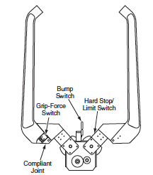 The design of the grippers provides passive compliance to simplify control of the gripping process: A spring loaded pivot at the base of each digit enables flexing to “open up the grip,” when the payload exerts an overload on the gripper. In the absence of a payload, mechanical hard stops and limit switches arrest the gripper and signal its closure. The compliant joint on each digit also includes a switch that provides limited feedback related to the gripping force, by signaling the point at which each digit flexes open. Another sensor that provides feedback is located in the “palm” of the gripper: a compliant bumper on a switch provides information related to the location of the payload; that is, whether or not the payload has been grasped.
