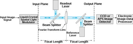 In the proposed method (see figure) the input image would be generated on a liquid-crystal spatial light modulator illuminated with a readout laser, which would be coherent with a reference laser. (It would be necessary to generate the input image in this way because the coherence of the laser light would be needed to form a hologram described subsequently.) A lens would be located at its focal distance from the input plane as well as from the output plane, where a charge-coupled-device (CCD) or an active-pixel sensor (APS) would be placed to detect the image. As a result, the Fourier transform of the input image would be formed on the image detector.