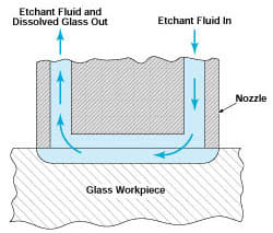 The technique involves a specialized nozzle with at least one delivery channel and one return channel for etchant fluid. By using a pressure pump to deliver the etchant and a suction pump to remove the dissolved glass, the etching process is highly controlled and localized. This approach prevents the roughening of the workpiece surface and eliminates contamination from particles, which are common issues in mechanical machining.