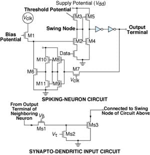 The lower part of Figure 2 shows a synapto-dendritic input circuit connected to the swing node of a spiking neuron. In a locally connected network, there could be eight input circuits like this one for coupling the outputs from eight nearest-neighbor neurons as inputs to the affected neuron. Transistor Ms1 sets the gain of the coupling, while transistor Ms2 controls the timing. Essentially, the spike from a neighboring neuron injects charge onto the gate of Ms3 through Ms1. This charge then slowly leaks away via Ms2 to produce a decaying exponential current response through Ms3. This current modulates the threshold of the spiking neuron by pulling M3 closer to saturation, thereby enabling a decreased membrane potential to trigger a spike.
