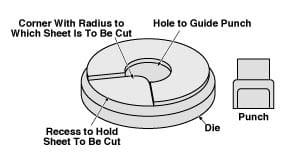 The figure shows a punch and die of the present type. Of course, the dimensions of the punch and die must be chosen to suit the thickness of the metal sheet and the corner radius to be formed. Thus far, punch-and-die sets have been made for sheet thicknesses up to 0.125 in. (≈3.2 mm) and corner radii from 0.2 to 2 in. (≈5 to 51 mm).