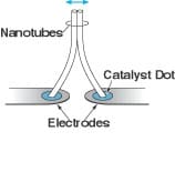 To be able to fabricate nanotube bimorph actuators with the configuration shown in the figure, it will be necessary to develop the means to control the positions and orientations of individual nanotubes on such substrates as silicon wafers. This is likely to entail the use of electron-beam lithography, lift-off, and etching for fabricating catalyst dots 5 to 15 nm wide on pre-patterned electrodes. Suitable catalyst materials could include Ni or alloys of Ni, Co, Fe, and/or Mo. In the contemplated CVD process, suitable precursor and carrier gases (e.g., methane, ethylene, or carbon monoxide plus hydrogen plus either argon or nitrogen) would interact with the substrate (which would be heated to a temperature between 600 and 950 °C), yielding selective growth of nanotubes out from the catalyst dots. There are numerous potential variations on this basic fabrication scheme, including orienting the dots so that the nanotubes grow parallel (instead of perpendicular) to the substrate surface and incorporating other materials to modify the electrical and mechanical properties of nanotube pairs.