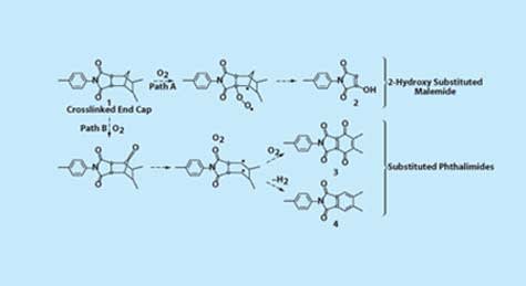 Research on the aging of PMR-15 polyimide has revealed that the degradation of the nadic end cap can occur via two primary reaction paths, designated A and B (see Figure 1). On path A, degradation proceeds through initial scission and oxidative opening of the norbornyl ring to form a 2-hydroxy substituted maleimide. On path B, degradation proceeds through oxidation of the bridging methylene of the norbornene moieties, followed by carbon monoxide extrusion. Aromatization of the resulting biradical leads to substituted phthalimides, and related secondary degradation products. The oxidation products of path A (including the 2-hydroxy substituted maleimide) are cleavage products that are most likely formed concomitantly with large loss of weight from the affected polymer. In contrast, the products of path B are more oxidatively stable and form with very little weight loss and with less shrinkage and cracking in the oxidized layer.