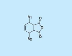 The present end caps are formulated to preserve the desirable processing properties of NE and to undergo thermo-oxidative degradation primarily or exclusively along path B. Figure 2 depicts a generic molecular structure for the present class of end caps. In this structure, the end cap contains no bridging methylene. Rather, the end cap is a 1,2,3,6-tetrahydrophthalic anhydride, substituted in such a way as to lower the cross-linking temperature from >415 °C to between 280 and 350 °C. The end cap maintains its stability during imidization (at 200 °C) and cross-linking. After the foregoing critical steps, the end cap is spontaneously converted, upon aging, to thermally stable capping groups.