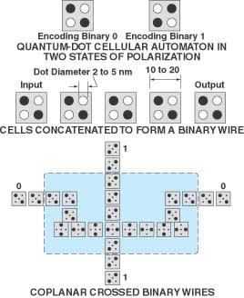 The polarization of a nonisolated cell depends on interactions with neighboring cells. The interaction between cells is one of Coulomb repulsion only (no current flows between cells) and provides the basis for computing with QCA. Theoretically, universal logic gates and binary wires could be constructed by assembling QCA of suitable design in suitable patterns. As to the possibility of coplanar crossing of signal paths without adverse effect, a compete theoretical explanation would exceed the space available for this article, but one can gain a partial, qualitative understanding from the illustration of crossed binary QCA wires in the bottom part of Figure 1.