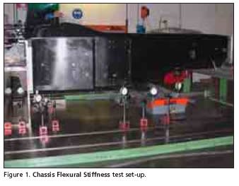 Other experimental measurements made on the chassis related to the handling behavior of the car include torsional stiffness, which can range from 15,000 to 40,000 N m/°; flexural stiffness; and engine fitting local stiffness. This test is made to check if the rear wall of the chassis is stiff enough to avoid a "hinge effect" at the interface with the engine, where there is a very high stiffness change. Once the safety targets are met, the global stiffness requirements typically are satisfied.
