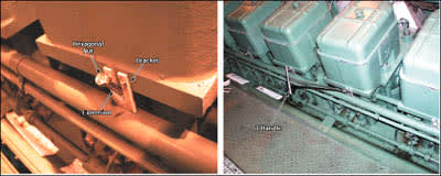 The blowdown-facilitating mechanisms consist of components attached permanently to the Kenny cocks plus at least one component that a technician carries from cylinder to cylinder. One of the components attached permanently to the Kenny cock on each cylinder is a swivel socket that fits onto the hexagonal bolt. An extension is attached to the swivel socket and is supported by a bracket, through which it protrudes. A hexagonal nut is attached to the end of the extension (see figure).