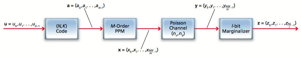 In the receiver, demodulation of the signal is effected in an iterative soft decoding process that involves consideration of relationships among photon counts and conditional likelihoods of m-bit vectors of coded bits. Inasmuch as the likelihoods of all the m-bit vectors of coded bits mapping to the same PPM symbol are correlated, the best performance is obtained when the joint m-bit conditional likelihoods are utilized. Unfortunately, the complexity of decoding, measured in the number of operations per bit, grows exponentially with m, and can thus become prohibitively expensive for large PPM orders. For a system required to handle multiple PPM orders, the cost is even higher because it is necessary to have separate decoding hardware for each order. This concludes the prerequisite background information.