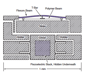 The combination of the polymer beams and the centrally clamped flexure beam would spring-bias the slider into a position such that, in the absence of electrostatic clamping, the gap between the slider on the one hand and both the driver and the holder on the other hand would be no more than a few microns. This arrangement would make it possible to electrostatically pull the slider into contact with either the holders or the driver at a clamping force of the order of 1 N by applying a reasonably small voltage (of the order of 100 V). The actuation sequence would be the following:
