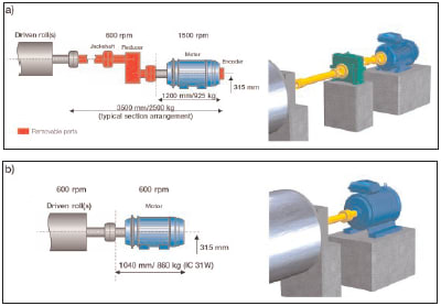 Standard induction motors, normally designed to run at base speeds between 850 to 3500 rpm, are not particularly well suited for low-speed operation, as their efficiency drops with the reduction in speed. They may also be unable to deliver sufficient smooth torque at low speeds. Use of a gearbox is the traditional mechanical solution for this challenge. However, the gearbox is a complicated piece of machinery that takes up space, reduces efficiency, and needs both maintenance and significant quantities of oil. Elimination of the gearbox via these new permanent magnet motors/drive configurations saves space and installation costs, energy and maintenance, and provides more flexibility in production line and facility design.