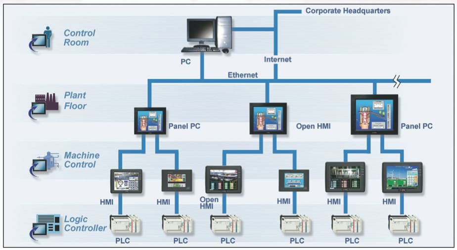 Today, when most people think of an HMI they think of a touchscreen control panel — a display that utilizes proprietary configuration software that allows you to create an interactive touchscreen application that can communicate with a controller, another HMI, or an industrial computer/panel PC. The configuration process involves loading the software onto a PC and then creating your application. Then the application is generally downloaded via serial, USB, or Ethernet cable to your HMI.