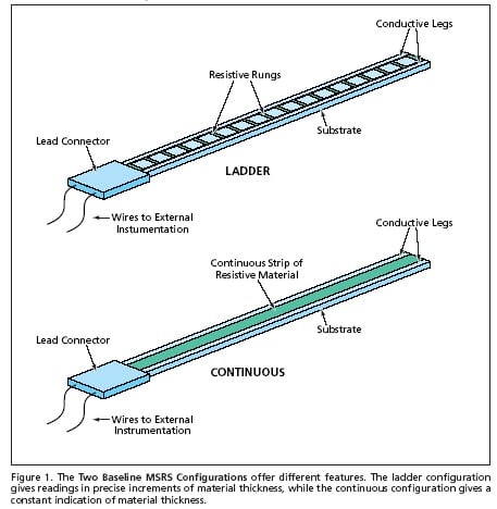 A continuous MSRS is so named because instead of discrete rungs, there is one continuous strip of resistive material across the legs. Assuming that this strip has spatially uniform thickness and resistivity and that the electrical resistance of the legs is much less than that of the strip, the electrical resistance of this MSRS is inversely proportional to the remaining length of the sensor and, hence, to the remaining thickness of the host material in which it is embedded.