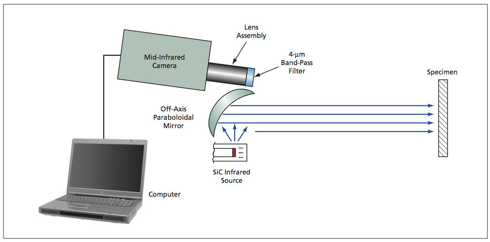 The camera is positioned a short distance (≈12 cm) from the specimen. The mid-infrared illumination is generated by a 50-watt silicon carbide source positioned to the side of the mid-infrared camera, and the illumination is collimated and reflected onto the specimen by a 6.35-cm-diameter off-axis paraboloidal mirror. Because the collected images are of a steady-state reflected intensity (in contrast to the transient thermal response observed in infrared thermography), collection times can be lengthened to whatever extent needed to achieve desired signal-to-noise ratios.