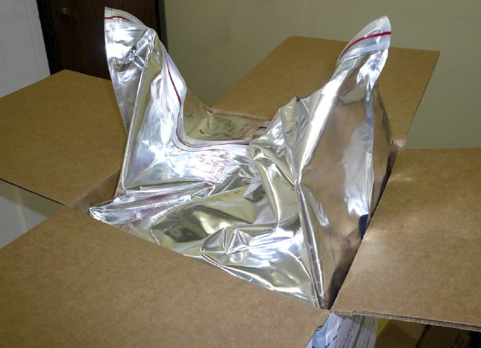 The second group of packages enhanced this single cardboard layer with a plastic bag. One box in this category featured an unsealed thin plastic liner, and the other cardboard box included a tape-sealed plastic bag. The third group of packages added a second layer of cardboard to the design, with the bags positioned between the two cardboard layers. This group also contained two package varieties: a double-box with a thicker, tape-sealed plastic bag, and a double box with a foil-plastic laminate bag containing a zip closure. Both of the packages in the third group performed better than the other packaging configurations, but out of all of the configurations, only the final package - the double box with the foil-plastic laminate bag - kept levels in the test chamber below all workplace exposure regulations and guidelines.
