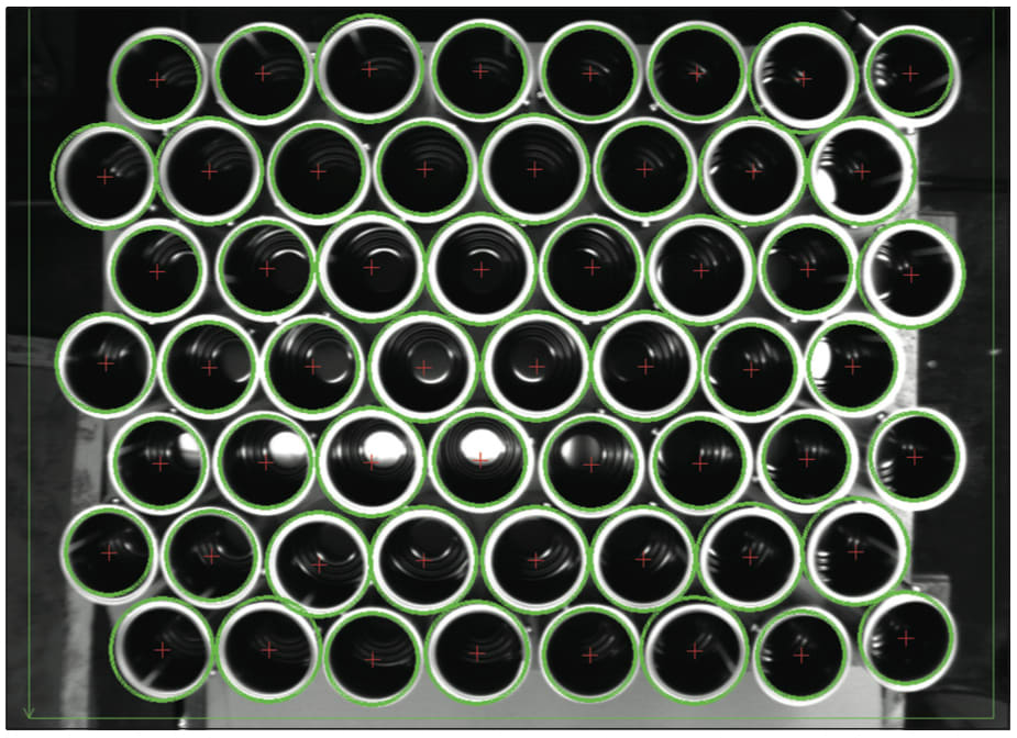 To get the required FOV, a camera with a short focal length lens was mounted above and at an angle to the can layers. Due to optical distortion from the short focal length lens, the can openings don’t look circular. The vision system corrects the image for some of this distortion. Due to perspective, the FOV decreases as each layer of cans is removed. The vision system compensates for changes in FOV and plane of focus by adjusting the lens’ zoom and focus for each layer of cans.