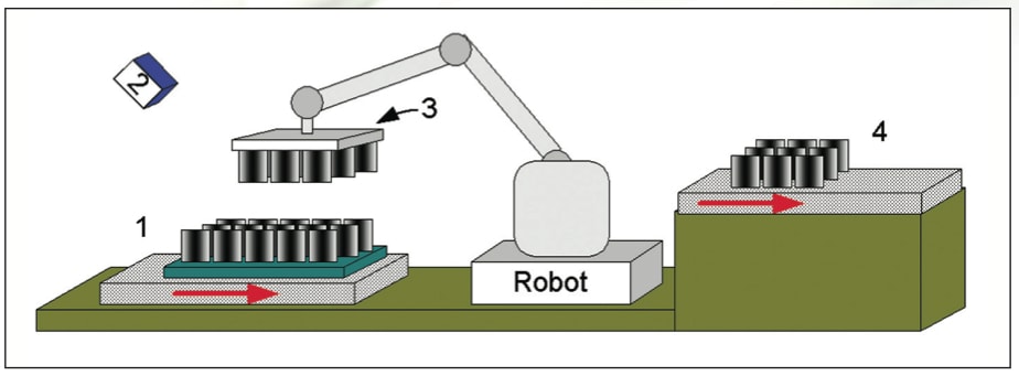 When all cans are within tolerance of the required position, the robot end effectors come down and pick up half (28) of the cans and place the cans onto the fill line conveyer. The robot then picks up the other half of the cans and puts them on the fill line. Then, the next slip sheet is removed to expose the next layer of cans and these are removed. This process repeats until the pallet is exposed. The robot then uses gripper end effectors to remove the pallet and stack it for recycling.