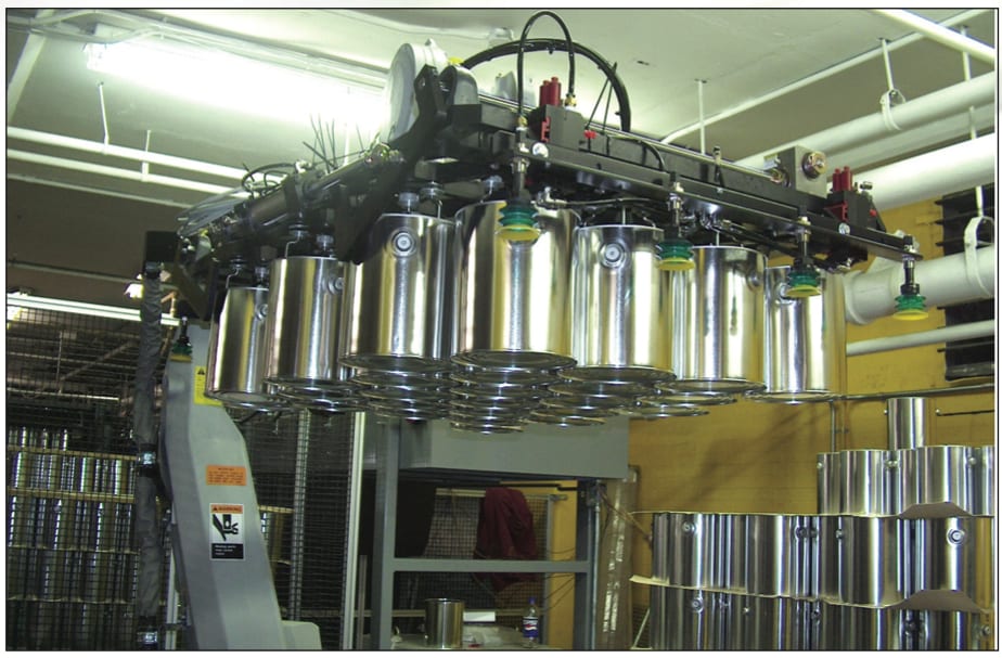 Using this system, the customer could eliminate two workers. The remaining worker clips the pallet’s retaining straps, monitors the system, and corrects out-of-tolerance can positions. This last task reduces throughput, as the robot system has to be safety-stopped while the worker enters the robot cage and corrects the can position. The solution is to require the can supplier to align the cans on the pallet to within tolerance.