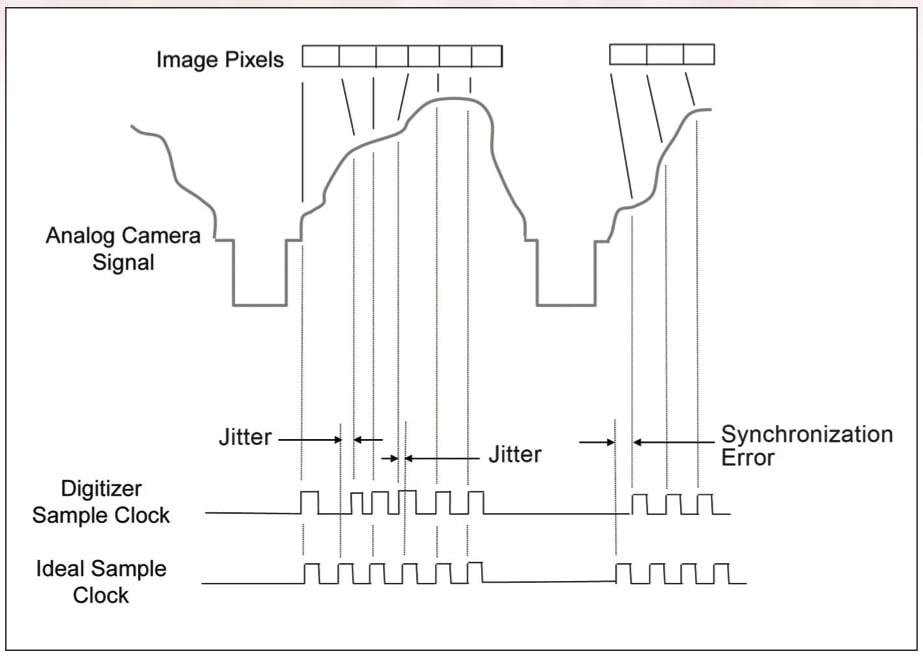 Using an external digitizer with an analog camera creates some side effects that complicate image processing. One is ambiguity in the relationship between the physical location that a digital sample represents and the corresponding pixel’s location in the digital image. The digitizer’s sample clock and the camera’s line signal sweep must be coordinated and repeatable for the resulting pixels to produce a spatially correct image. Synchronization errors, as well as timing jitter in the sampling clock, will result in image pixels that are offset from their true location (see Figure 2).