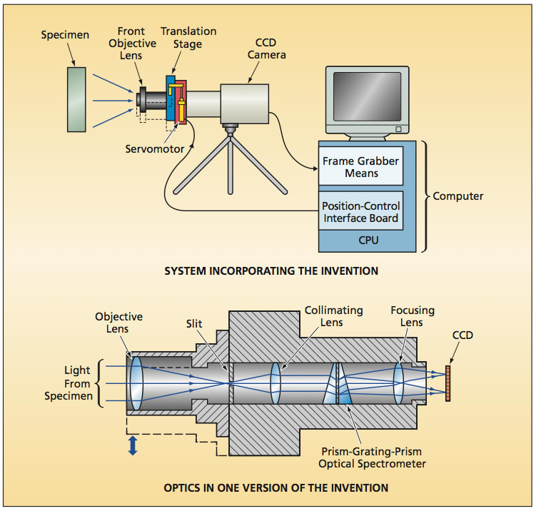 The upper part of the figure depicts a generic proposed microscope-based hyperspectral imaging system incorporating the invention. The optical assembly of this system would include an objective lens (normally, a microscope objective lens) and a charge-coupled-device (CCD) camera. The objective lens would be mounted on a servomotor-driven translation stage, which would be capable of moving the lens in precisely controlled increments, relative to the camera, parallel to the focal-plane scan axis. The output of the CCD camera would be digitized and fed to a frame grabber in a computer. The computer would store the frame-grabber output for subsequent viewing and/or processing of images. The computer would contain a position-control interface board, through which it would control the servomotor.