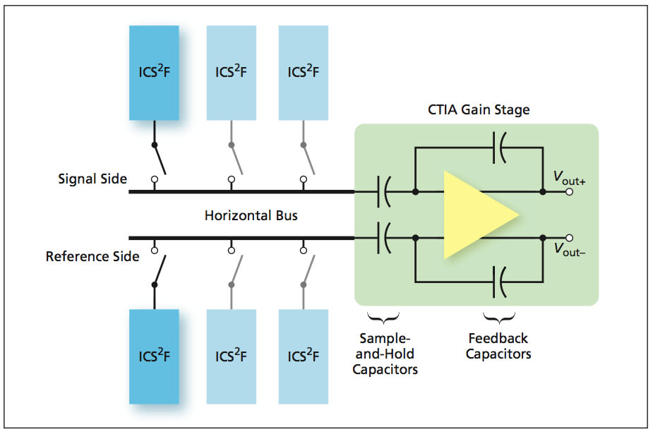 The improved design (see figure) provides a switched source follower in each column, one each for the signal and reference samples [denoted an in-column switched source follower (ICS2F)], followed by a single capacitive transimpedance amplifier (CTIA) gain stage. The ICS2F consists of a different configuration of the column-selecting FET such that no DC bias current flows through it, and hence, without the associated ohmic voltage drop. Unlike in a prior operational-amplifier-based design involving direct connection of the sample and hold capacitors to the row-bus, the input terminals of the amplifier present CTIA gain stage are not in direct contact with the bus and, therefore, this stage produces voltage gain without the bandwidth reduction and noise multiplication that is caused by the Miller effect. Secondly, as a result of using ICS2F, the bus carries a predominantly voltage signal, (as opposed to a predominantly charge signal as in a prior operational-amplifier-based signal chain). Hence, the charging and discharging of the bus is not slowed by the Miller effect, enabling reduction of the bias current from the value that would otherwise be needed. The elimination of the ohmic drop across the column-selecting switch reduces the output voltage offset to a minimum, eliminates nonlinearity, and makes the small-signal gain approach its ideal value of unity.