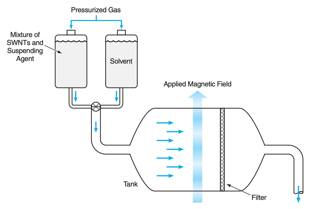 The great variety of tubular fullerene molecules and of the structures that could be formed by assembling them in various ways precludes a complete description of the present method within the limits of this article. It must suffice to present a typical example of the use of one of many possible variants of the method to form a membrane comprising SWNTs aligned substantially parallel to each other in the membrane plane. The apparatus used in this variant of the method (see figure) includes a reservoir containing SWNTs dispersed in a suspending agent (for example, dimethylformamide) and a reservoir containing a suitable solvent (for example, water mixed with a surfactant). By use of either pressurized gas supplied from upstream or suction from downstream, the suspension of SWNTs and the solvent are forced to mix and flow into a tank. A filter inside the tank contains pores small enough to prevent the passage of most SWNTs, but large enough to allow the passage of molecules of the solvent and suspending agent. The filter is oriented perpendicular to the flow path. A magnetic field parallel to the plane of the filter is applied.
