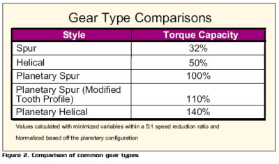 Other types of gearing that have found their way into many applications are bevel gearing (to accommodate non-parallel shafting), worm gearing (for higher ratios in non-parallel shafting and elimination of back-driving potential), and helical gearing. Helical gearing is similar to spur gearing except the teeth of the gears are not straight or parallel to the axis of rotation. Instead they have a helical twist to them. The result of the helix gear mesh is that the contact ratio is increased and the gearhead can be exceptionally strong and smooth. Helical gears can be utilized almost anywhere spur gears are employed. In addition to a cost disadvantage, helical gearing usually produces axial resultant forces on both the drive gear and the driven gear. For this reason all planet gears have to be captivated on both sides of the gear and both the input pinion and output carrier plate/shaft have to be supported with bearings to handle the axial loading. (See Figure 2 for a gear type comparison.)