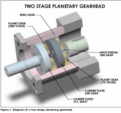 Planetary gearheads distribute the input power coming from the sun gear (input pinion) to two or more planetary gears. Since the planet gears are positioned symmetrical to the pinion gear, radial loading on the pinion gear is eliminated. The planet gears are housed within a ring gear, which has gear teeth cut into the inside diameter in a reversed tooth profile. The separating forces (radial force) produced from the planet gears’ tooth engagements with the sun and ring gears, cancel each other. The ring gear is stationary, and the input sun gear pinion drives the planet gears, which then walk in the same rotational direction as the sun gear.