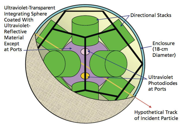 The spherical Cherenkov detector would include a sphere of ultraviolet-transparent material (e.g., sapphire, quartz, or an acrylic polymer) having an ultraviolet index of refraction greater than 1. The sphere would be coated with an ultraviolet-reflecting material except at small ports. SiC photodiodes or optical fibers leading to photodiodes would be mounted facing into the sphere at the ports to enable detection of Cherenkov ultraviolet light emitted within the sphere.