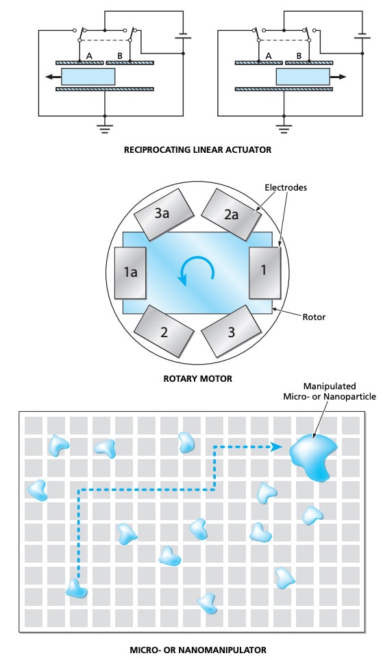 A rotary motor, shown in the middle part of Figure 2, could include a dielectric rotor sandwiched between a top and a bottom plate containing multiple electrodes arranged symmetrically in a circle. Voltages would be applied sequentially to electrode pairs 1 and 1a, then 2 and 2a, then 3 and 3a in order to attract the dielectric rotor to sequential positions between the electrode pairs.