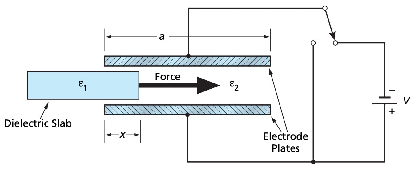 where V is the potential applied between the electrode plates, ε1 is the permittivity of the dielectric slab, ε2 is the permittivity of air, a is the length of an electrode plate, and d is the thickness of the gap between the plates.