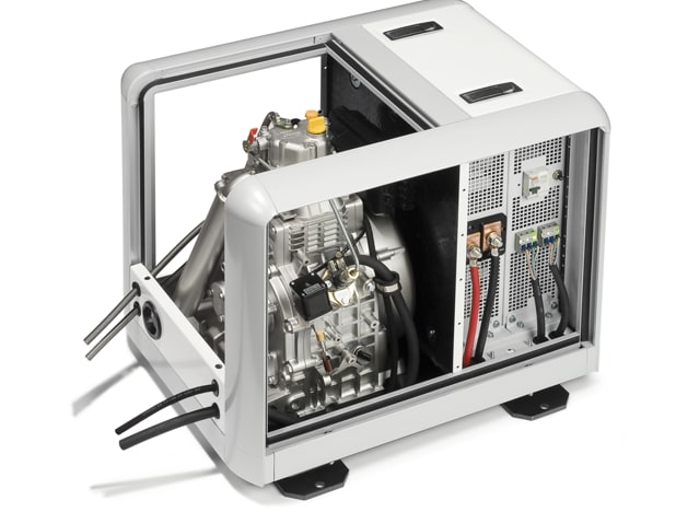 The inverter is connected to a lithium-ion battery, either as part of the Genverter or externally. The available voltages are 12, 24, or 48 VDC. When the battery approaches a specific discharge level, the diesel motor automatically switches on to take over the users and recharge the battery.