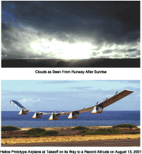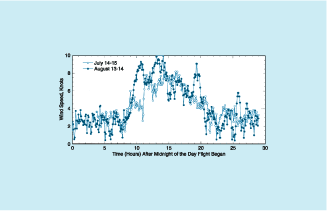 In general, the primary weather data of concern for ground and flight operations are wind speeds (see Figure 1). Because of its long wing span [247 ft (Å75 m)] and low weight [1,500 to 1,600 lb (about 680 to 726 kg)], the Helios airplane is sensitive to wind speeds exceeding 7 kn (3.6 m/s) at the surface. Also, clouds are of concern because they can block sunlight needed to energize an array of solar photovoltaic cells that provide power to the airplane. Vertical wind shear is very closely monitored in order to prevent damage or loss of control due to turbulence.