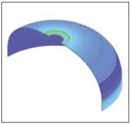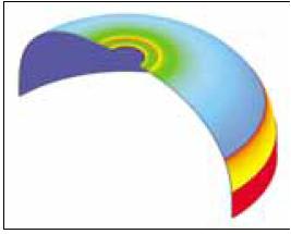 - Analysis of the end domes is critical. Ideally, the engineer creates a dome contour that allows the filament to follow geodesic paths, keeping tension uniform (isotensoid) along the length of the fibers. However, because of the curvature at the cylinder ends, and because of additional features such as bosses or gasketing surfaces, filament winding at the end domes is not purely geodesic. As a result, the designer requires nonlinear analysis to determine how the tension changes across the end domes (Figure 2). Note that much of the end dome color is constant, indicating uniform tension in the fibers, and the fiber strain increases as it approaches the polar opening.