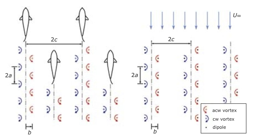A potential flow model of inter-VAWT interactions is developed to investigate the effect of changes in VAWT spatial arrangement on the array performance coefficient, which compares the expected average power coefficient of turbines in an array to a spatially-isolated turbine. A geometric arrangement based on the configuration of shed vortices in the wake of schooling fish is shown to significantly increase the array performance coefficient based upon an array of 16x16 wind turbines.