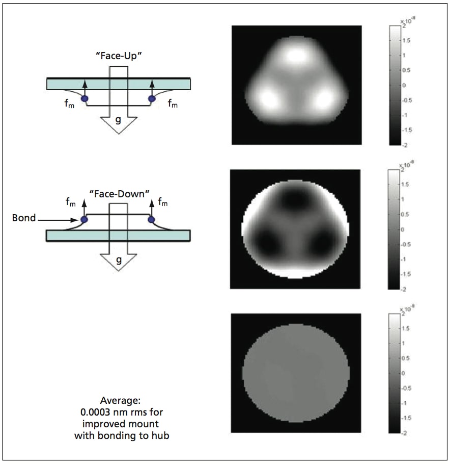A simple improvement to the mounting scheme is shown in Figure 2. Mount members are now attached by bonding, so mount forces in the two configurations are applied at identical positions. Also, mount members are attached to the hub of the mirror, well away from the mirror surface whose zero-gravity figure is being measured; by the St. Venant principle, small errors in effective positioning of mount members have little effect when propagated to the mirror surface. The resulting error in the zero-gravity averaged map is now only 0.0003 nm rms.