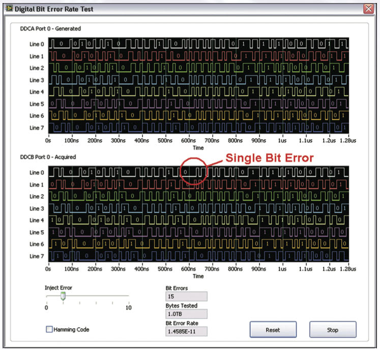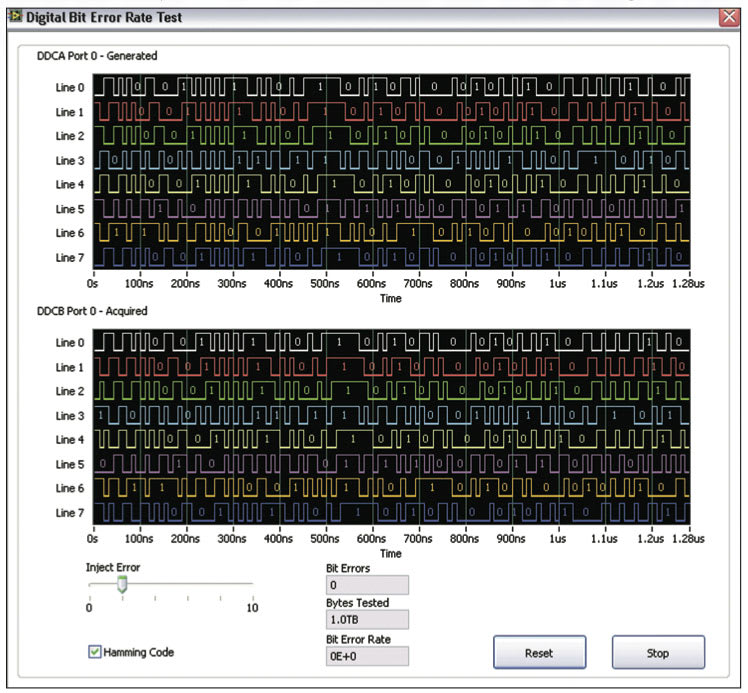 With the speed of an FPGA, this code can run at 100 MHz for hours on end, providing a means to exhaustively test the device or design. Figure 2 shows a trace of the generated and acquired data, along with the total amount of data transferred, the number of bit errors, and the effective bit error rate. In this example, errors are injected onto the bus to simulate a noisy environment. You can see that the FPGA effectively identified 15 single-bit errors in over 1 TB of bus data. These errors would be difficult to detect through standard test vectors on traditional test hardware operating at a limited duty cycle.