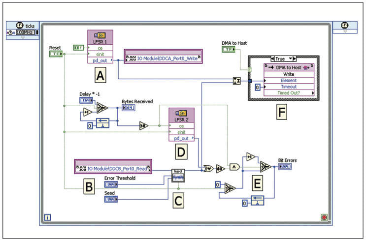 Figure 1. NI LabVIEW FPGA code for a continuous bit error rate tester, showing the simplicity of a high-performance application. Enter FPGAs. Field-programmable gate arrays (FPGAs) have long been used to implement hardware-defined functionality in prototype and low volume systems due to their versatility, reconfigurable nature, and cost advantages over custom silicon. But as development tools continue to evolve, FPGA technology is becoming more accessible to a broader variety of users. One new application area for FPGAs is in automated test because FPGAs bring a number of advantages to test systems, namely algorithm parallelism, higher performance processing, and ultra-low latency decision making. FPGAs can add value to the design process by running extended high-level or real-world tests, interfacing with the design-under-test in a deterministic manner, with the processing capabilities to sufficiently model the outside world in real time. Take, for instance, a high-speed digital bus. Any communications channel has some non-zero probability of inducing errors, and it is important to know if the theoretical performance calculated during design holds true in the real world. Performing such a measurement using traditional methods would be prohibitively slow, however, due to the vector-based nature of most digital test equipment. As significant time would be spent creating test vectors, transferring data to and from instrumentation, and comparing stimulus and response data, the fraction of time spent actually transmitting or receiving data over the bus would be quite low. If all this functionality is instead moved onto an FPGA and the pattern generation and comparison calculations are performed in real time, the duty cycle of the test reaches 100 percent. Furthermore, this can be completely automated and requires no human intervention. In this manner, bus tests of hours or even days can be run to gain greater confidence in the design.