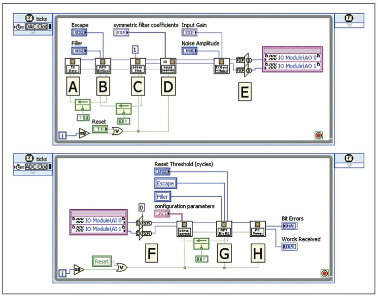 Figure 4. NI LabVIEW FPGA code for bit error rate test of a differential 8-PSK communications channel. Swapping the high-speed digital adapter module used to test the bus in the first example for a baseband analog module, you can now test analog communications channels. Figure 4 shows the FPGA code for the link and physical layers of a communications system. The top loop generates data to be sent to dual digital-to-analog converters (DACs) for baseband (I and Q) transmission at 25 MS/s, and the bottom loop acquires data from dual analog-to-digital converters (ADCs) at 25 MS/s and compares the received data to that which was transmitted. In the generation loop, block A creates dynamic yet deterministic packets of data for transmission, while block B adds framing information to the digital data. Block C performs differential, 8-phase-shift-keying (D8PSK) modulation, and block D adds pulse shaping to minimize spectral emissions. Section E provides the ability to add gain and noise to the data streams before sending the data to the DACs. In the acquisition loop, section F acquires samples from the ADCs and performs D8PSK demodulation. Block G removes the framing information, and finally block H phaselocks packets of received data to locally-generated data (using the same method as in block A), counts the amount of data received, and searches for and accumulates any errors.