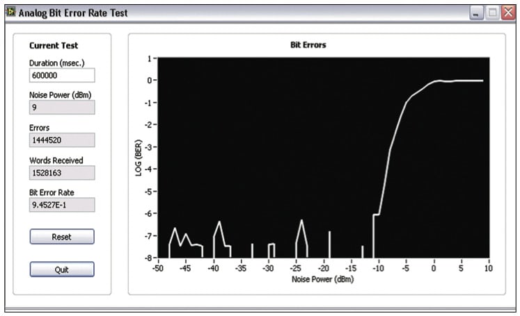 A simple host application (as seen in Figure 5) can again run tests of this communications channel for hours on end this time varying the noise injected into the analog channel. You can see that as the noise increases, the bit error rate approaches 100 percent. In addition to white noise, you can also add other impairments such as adjacent channel interference, unintended spurs, or even multi-path fading.