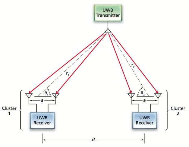 The figure schematically depicts a simple system of this type engaged in tracking a single UWB transmitter on a plane. The system includes two UWB-receiver assemblies, denoted clusters, separated by a known length d. Within each cluster is a UWB receiver connected to two antennas that are separated by a length a that is much shorter than the aforementioned length d. The signals received by the two antennas in each cluster are subjected to a process of cross-correlation plus peak detection to measure differences between their times of arrival. It is assumed that the distances (r1 and r2) between the clusters and the transmitter are much greater than a, as would usually be the case in most practical applications. Then the angles of arrival of the signals at the clusters are given by θ1≈arccos (cτ1/a) and θ2≈arccos (cτ2/a); where θ1 and θ2 are as shown in the figure; c is the speed of light; τ1 is the difference between the times of arrival of a pulse at the antennas in cluster 1; and τ2 is the difference between the times of arrival of a pulse at the antennas in cluster 2. Then using θ1 and θ2, the two-dimensional location of the transmitter, relative to the known locations of the clusters, is calculated straightforwardly by use of the triangulation equations.